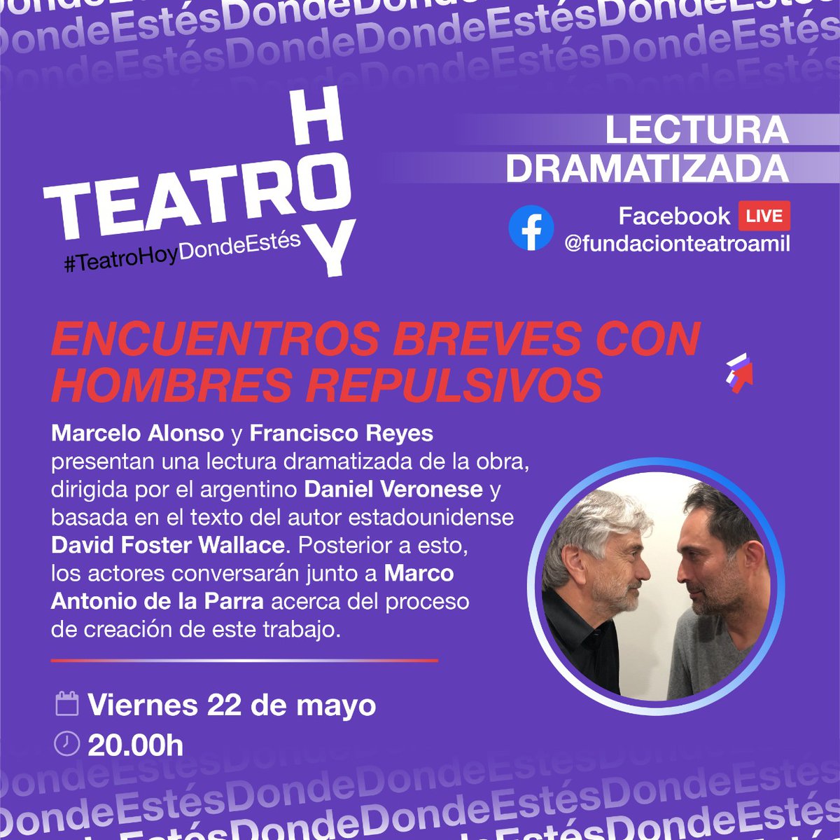 Esta semana también se realizará la lectura dramatizada de Encuentros breves con hombres repulsivos, obra que indaga en temas como la falta de comunicación entre géneros y la crisis de la masculinidad en la sociedad contemporánea. Francisco Reyes y Marcelo Alonso serán los encargados de compartir un fragmento de esta pieza teatral vía Facebook el día viernes 22 de mayo a las 20:00 horas. Luego de la lectura dramatizada, los actores conversarán junto a Marco Antonio de la Parra acerca de las distintas reflexiones que plantea este trabajo, cuyo estreno formó parte de la programación de Santiago a Mil 2020.