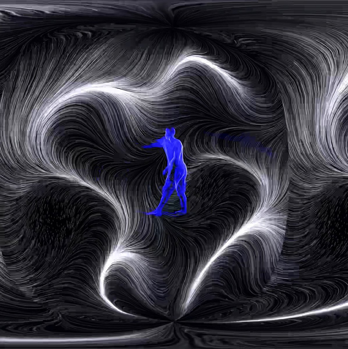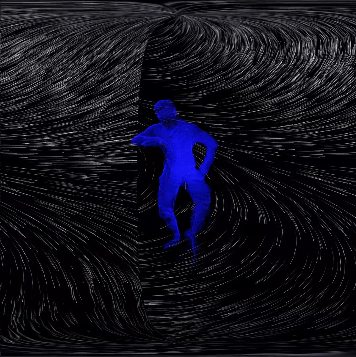 Una línea horizontal proyectada en la pantalla tiembla. De repente, la línea se multiplica drásticamente como si descargara su energía inmanente. Del mismo modo, cuando Hiroaki Umeda tiembla en el escenario, la energía oculta retenida en su cuerpo se transmite desde la pelvis a la columna vertebral, a los brazos, y finalmente a la pantalla, en la que la energía se visualiza mediante líneas curvas que recuerdan una corona solar.