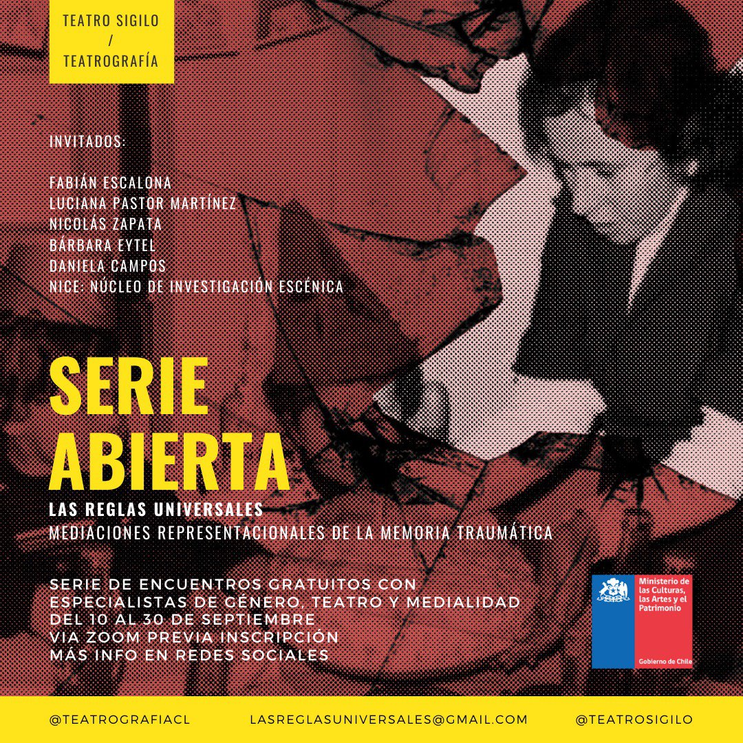 “Serie abierta” es el nombre de encuentros que se realizará entre el 10 y el 30 de septiembre, formando parte de la primera fase de apertura de proceso del proyecto financiado por Fondart Nacional 2020: Las reglas universales, mediaciones representacionales de la memoria traumática