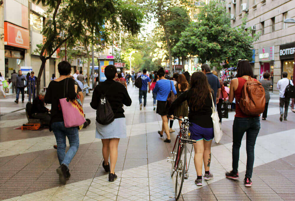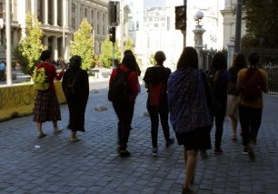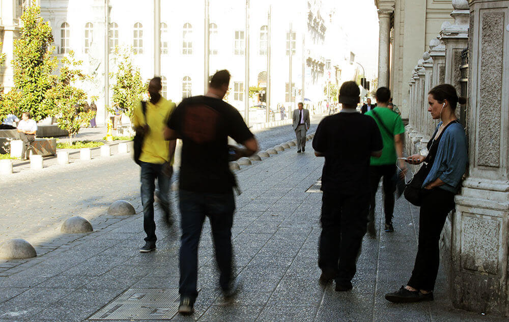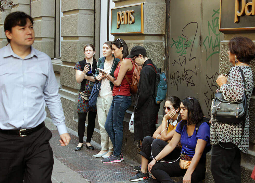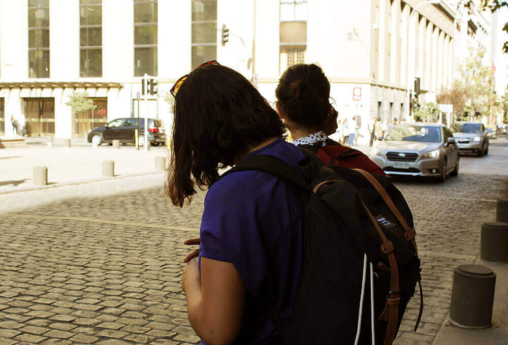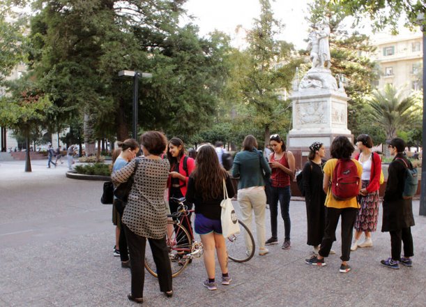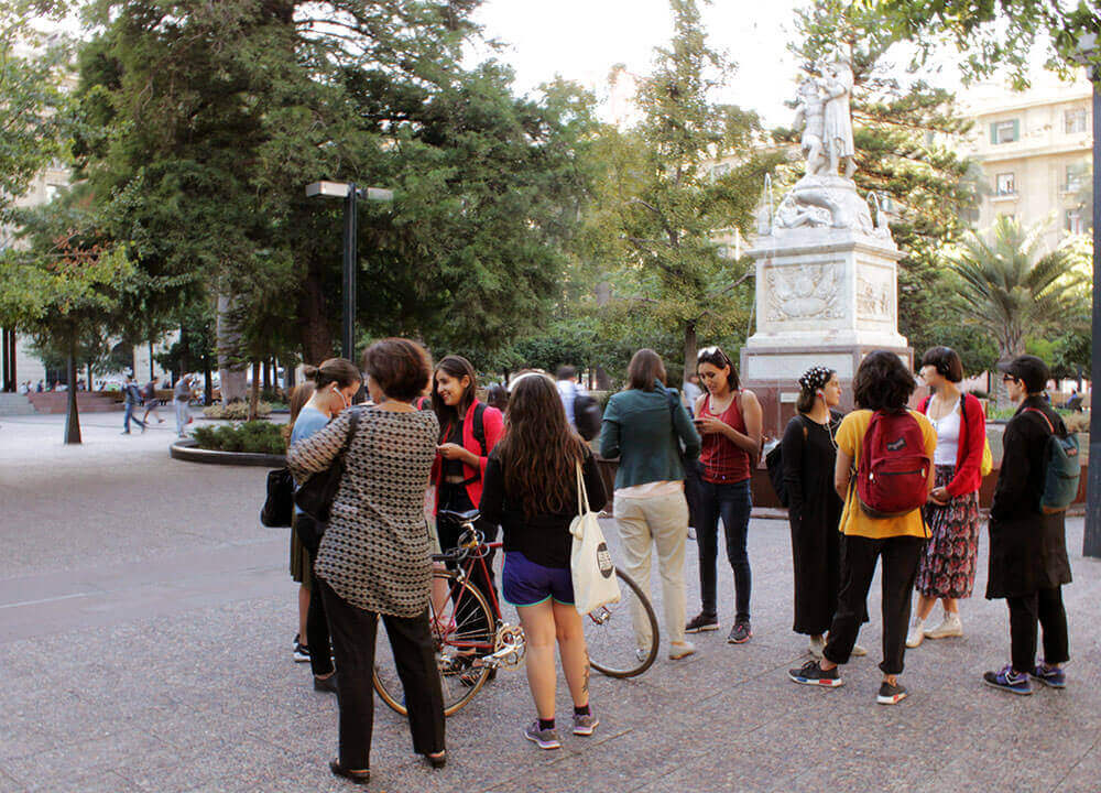 Armadas con un celular y audífonos, todas ellas se preparaban para comenzar un audio-recorrido por el centro de la capital gracias a la aplicación móvil AppRecuerdos, que a través de 129 relatos de audio que se activan por geolocalización entre Plaza Italia, La Moneda, Parque Almagro y el Mercado Central; invita a vincular el espacio público y la memoria que habita la ciudad. “Es una nueva manera de conocer y recordar la ciudad, porque vas teniendo nuevas y muchas imágenes”, dice Francisca, investigadora de 36 años, quien realiza la actividad por primera vez. “Es una manera de recorrer Santiago con la que te vas más nutrida, porque Santiago no es una ciudad de memoria. No te vas encontrando con pistas que te hablen un poquito de lo que ahí pasó, más allá de los monumentos a los milicos que hay. Lo que me gusta es que la aplicación es eterna e infinita, siempre va a estar ahí. Puedes jugar con esa aplicación en contextos muy diferentes, como hoy”.