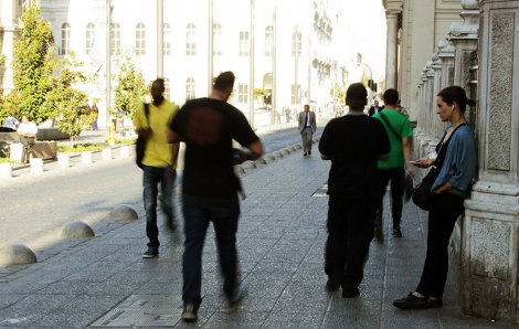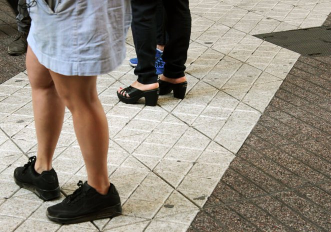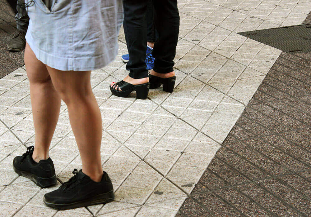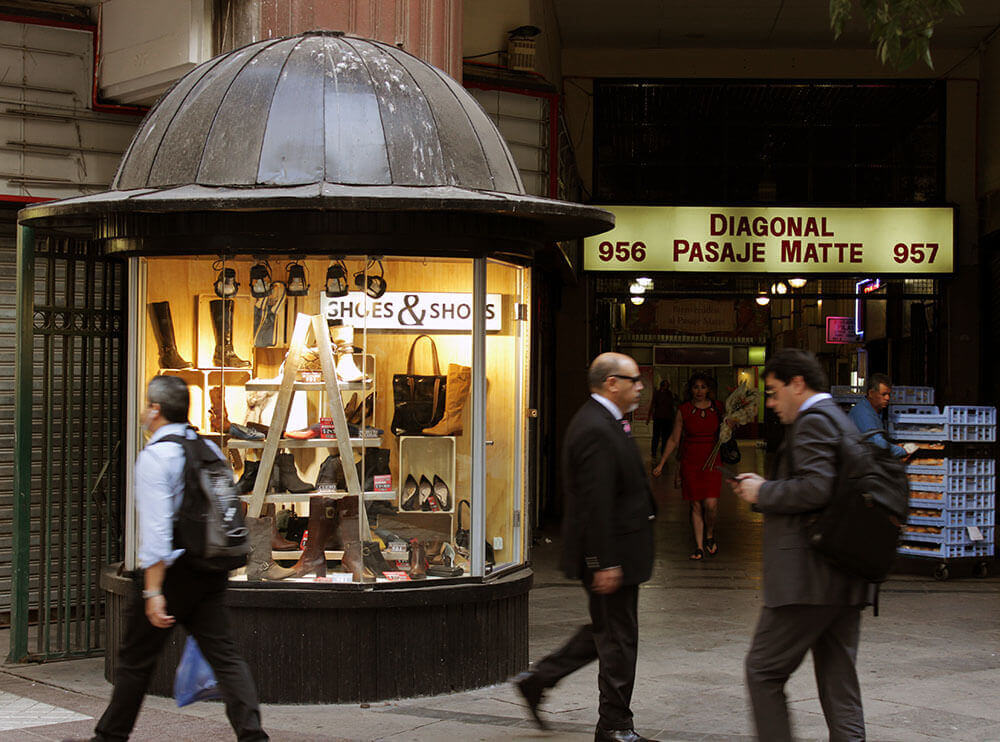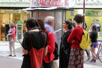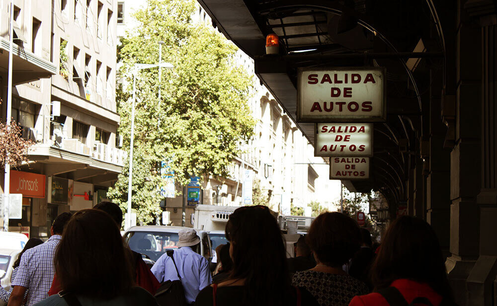 Entre las miradas del resto de los transeúntes, el grupo se mueve nuevamente hasta Paseo Ahumada. Kioskos, farmacias y tiendas comerciales funcionan como escenario para Por el sí, un relato de una adherente a la dictadura de Pinochet; y El Mazinger, una historia narrada por la actriz Paulina García que reúne actores, carabineros, mapuches y prostitutas en la Primera Comisaría de Santiago. “Me pareció un relato muy violento”, agregará más tarde Javiera. “Lo que cuenta sobre lo que pasa en la comisaría es bien impactante, porque hace un relato muy específico sobre los cuerpos, la descripción de la escena y uno se ve afectado por la manera en cómo ella lo describe”.