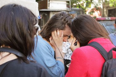 En nuestro camino hasta la penúltima parada nos encontramos con dos agrupaciones manifestándose frente al palacio presidencial con motivo de la conmemoración: mujeres amordazadas con cintas moradas, reclamando contra la violencia machista; y adherentes a la Presidenta Michelle Bachelet entregando su apoyo frente al memorial de Salvador Allende. Con ellos de fondo escuchamos No tengáis miedo de mirarlo a él, y revivimos la visita del Papa Juan Pablo II a Chile y el contingente que lo llevó a La Moneda.