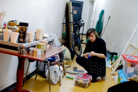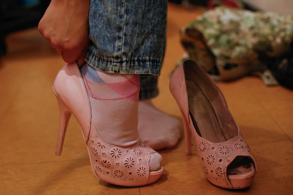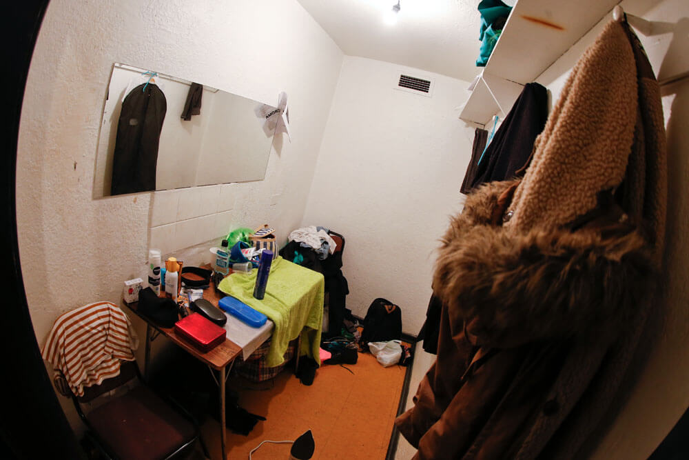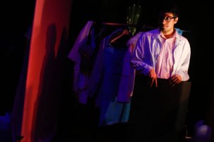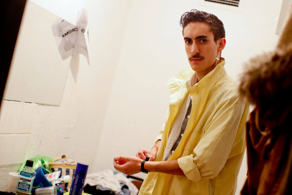 Más de una docena de empinados escalones separan el escenario de los camerinos. En el subterráneo, aproximadamente 30 piezas de vestuario –cada actor se cambia tres veces en toda la obra– cuelgan a lo largo de un frío pasillo que luce tres camarines y dos baños. Entre pantalones, chaquetas, vestidos de color pastel, y otros atuendos típicos de la década del 80; una de las integrantes de la compañía revisa cajas llenas de materiales. Mientras, algunas de las actrices terminan de retocar su maquillaje y peinado, y conversan sobre la obra con un marcado acento español. No es sorpresa, ya que cada uno de los protagonistas interpreta a un integrante de una compañía cinematográfica española.