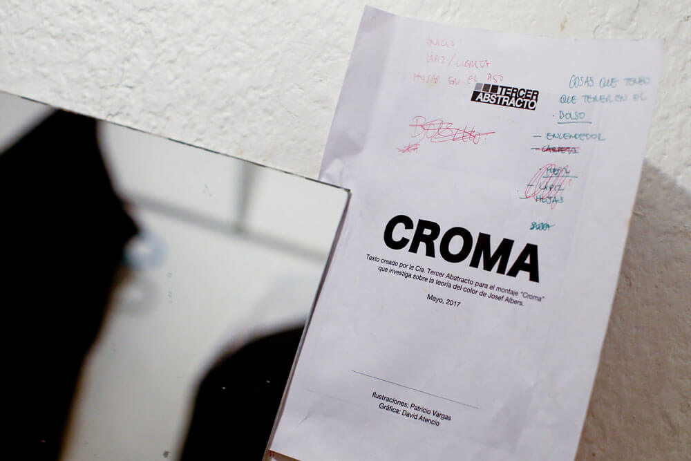Gente circulando de un lado para otro. Ése es el panorama que se ve en cada rincón del Teatro Camilo Henríquez desde que la compañía Tercer Abstracto llegó al recinto ubicado en calle Amunátegui 31, para montar su obra Croma. La agrupación, integrada por 17 personas –once de ellas son los actores en escena–, se pasea de un lado para otro siguiendo instrucciones de su director, David Atencio, intentando afinar detalles para la que será su primera temporada en el Ciclo Teatro Hoy.