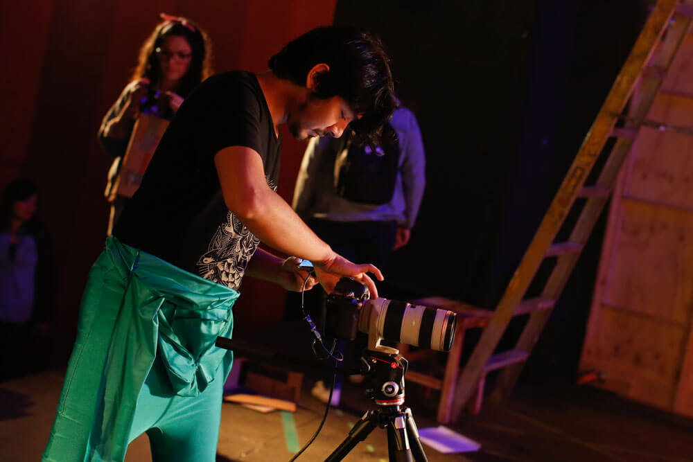 Ya en la sala, y antes de empezar a actuar, los intérpretes se preocupan de otras cosas: ubicar ciertos elementos en determinado lugar de la escena, revisar si falta alguno, calcular cuánto espacio tienen para moverse y realizar las acciones de la obra, probar la proyección de sus voces hacia las butacas del público y revisar las conexiones de una cámara de video cuyas imágenes se mostrarán en una pantalla que cae del techo.