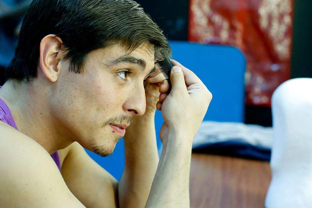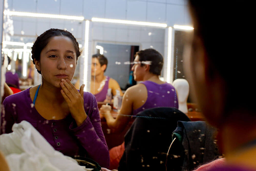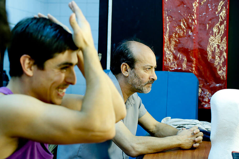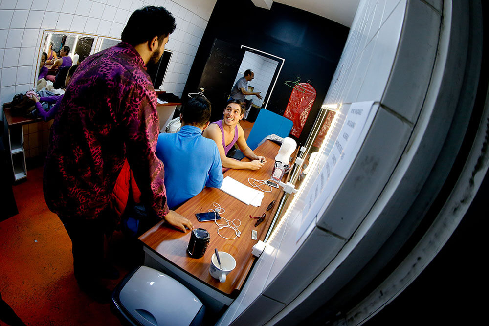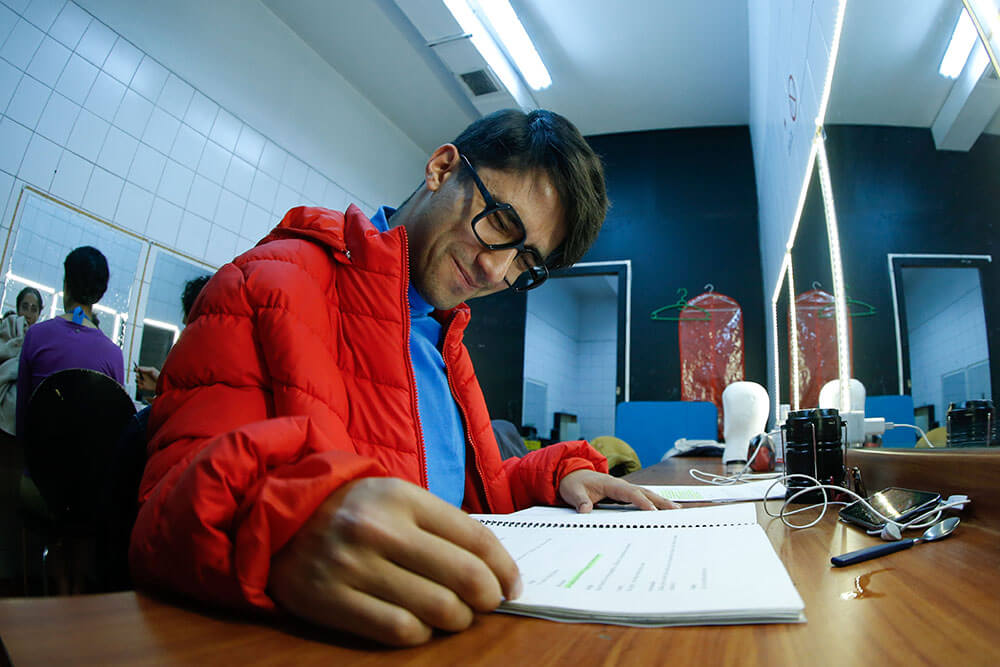 Uno de los más risueños es Jaime Leiva, el encargado de dar vida a Sócrates, el protagonista de la historia. ¿Cuál es su secreto? “Me vengo caminando. Siempre camino por lo menos media hora antes de cada función”, explica sonriente mientras dos de sus compañeras se maquillan, y otro se peina una y otra vez con gel. “Me ayuda a soltarme y llego más preparado. Lo que hago es venirme en metro y me bajo en alguna estación anterior, como Santa Ana, por ejemplo, y de ahí me vengo tranquilo hacia el teatro”.