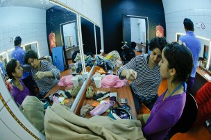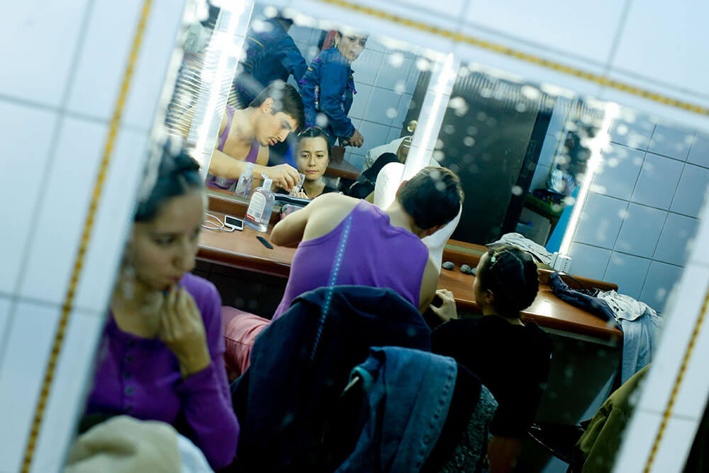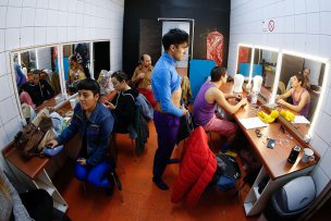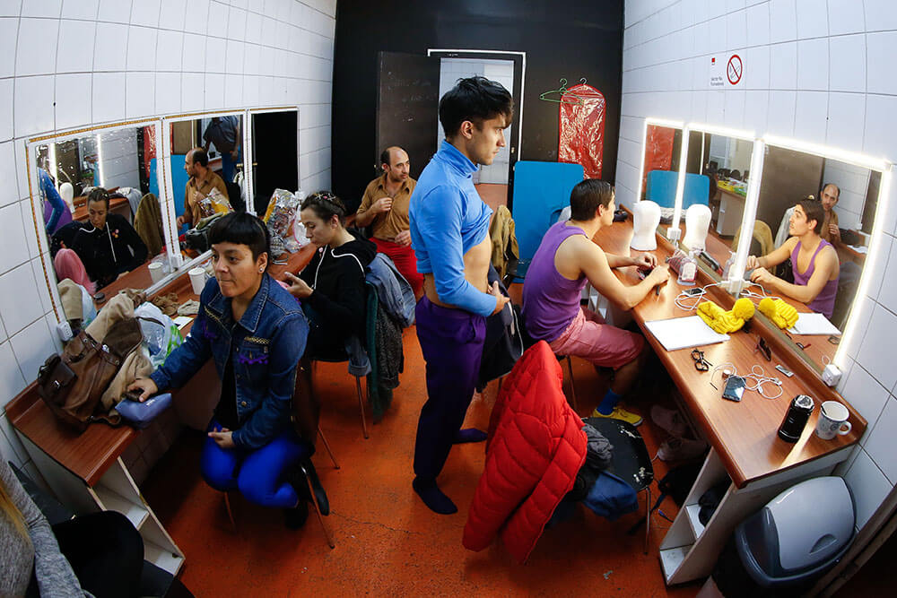 Además del vestuario repartido por la parte posterior del escenario, está lo que cada uno de los actores ya tiene puesto cuando aún resta media hora para el estreno. Colores amarillos, celestes, morados, rojos y cafés se funden en el camarín donde los intérpretes se pasean de un lado para otro, pero donde hay más risas y tranquilidad que en la sala.