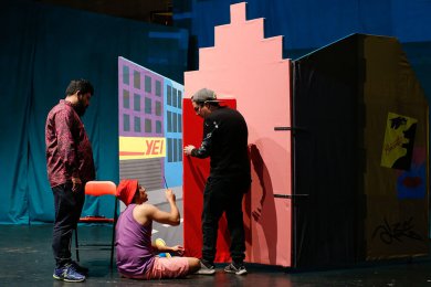 Lo que se vive en el teatro principal del Centro Cultural Matucana 100 se podría dividir en dos mundos distintos. En la sala misma, los técnicos se mueven de un lado a otro revisando los últimos detalles de audio, de video, de luces. En la parte alta de la platea, y detrás de un computador, Los Contadores Auditores prueban las proyecciones que se utilizarán durante la función. “Siempre son un culo”, dice riendo Juan Andrés Rivera, dramaturgo de Surinam.