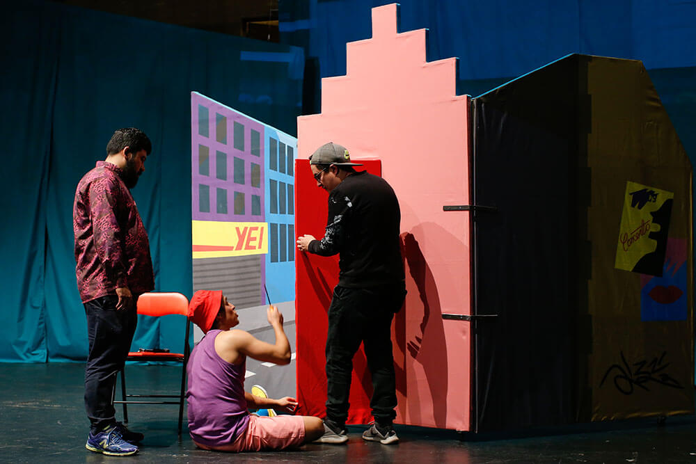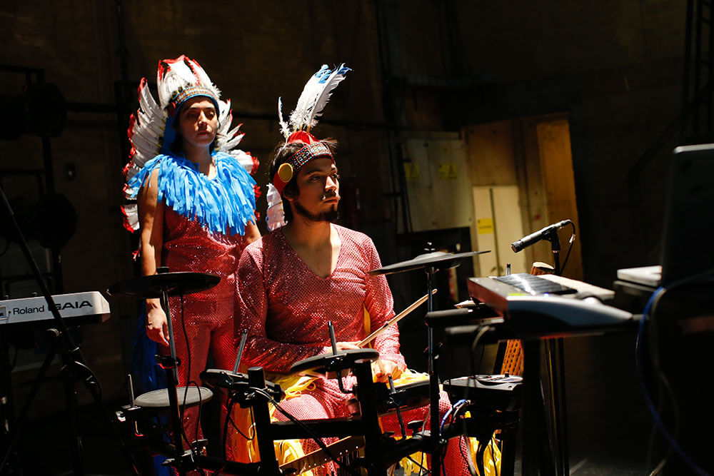 En el escenario, algunos de los artistas trabajan con parte de la escenografía: la revisan, la corchetean y pegan ciertas partes que se niegan a quedar en su lugar. A un costado, una banda de instrumentos aguarda ser tocada por una particular agrupación de músicos integrada por Rocío y Octavio O’Shee, Loreto Ríos y Daniel Marabolí; que se reunió especialmente para la obra. Teclados, una batería eléctrica, una guitarra e incluso un palo de agua esperan musicalizar cada una de las escenas cuyos intérpretes brillarán –literalmente– a un costado de toda la acción.