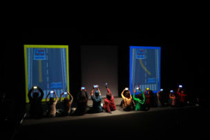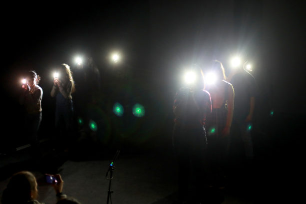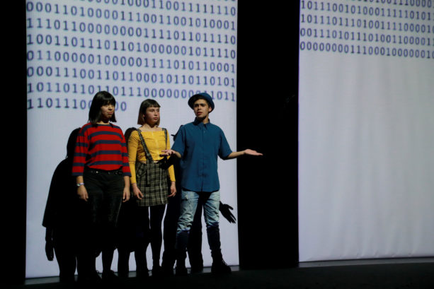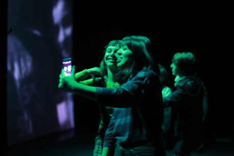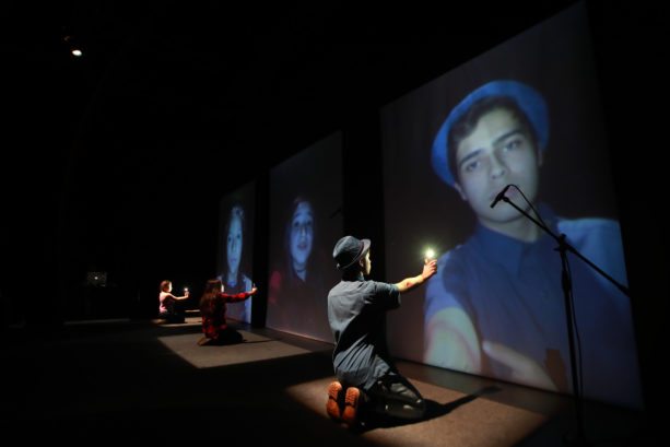 La obra tiene imágenes preciosas, todo el tiempo juega con las luces e involucra esa tecnología que todos tenemos y que pocos entendemos o reflexionamos en torno a ella: el celular. Podemos ver en escena a estos niños y niñas contando sus propias historias. Gracias a la aplicación que ocupa este montaje, lo que graban sus celulares se transmite en tiempo real a una proyección. La imagen es bastante familiar, todos nos grabamos frente a nuestro teléfono diciendo algo desde que tenemos Instagram, por ejemplo. Sus historias son las de cualquier joven inmerso en el mundo de las redes sociales de manera tan automática, integrándolas a sus vidas como quién decide tomar desayuno a diario.