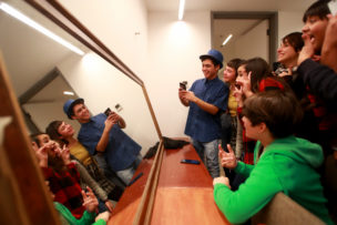 Los intérpretes cargan sus teléfonos. Una vez con la batería al 100% se conectan a la aplicación creada específicamente para este montaje, y vemos sus caritas en modo selfie proyectadas. Es como si estuvieran transmitiendo en vivo en sus historias de Instagram, pienso. Están repasando y viendo los últimos ajustes antes de comenzar el ensayo de corrido, revisan sus diálogos y se corrigen unos a otros, de manera amistosa y colaborativa. María José Contreras y Trinidad Piriz se ven felices, están más nerviosas que los niños. Se acercan a ellos y les dan las últimas indicaciones. Preguntan ¿Se sienten preparados para hacer una pasada con público? y responden en masa: NOOOO! entre un alboroto de risas jocosas, con el único fin de bromear a las directoras.