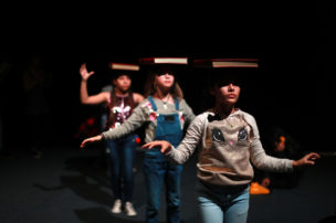 Terminan de ensayar esta escena y ya es hora de vaciar la sala para que empiecen a entrar sus familias, invitadas a presenciar este a obra en la que vienen trabajando desde enero. Nos vamos a los camarines. Es difícil entender sus conversaciones, están todos gritando y a ratos escucho parte de los diálogos de la obra. Unos ensayan en el espejo, otros se maquillan. Por otra parte tenemos a los que prefieren concentrarse alejados del tumulto, pero son los menos. “Estoy segura que se me va a olvidar lo del BIG DATA, EL BIG DATA” dice una chica, todos se ríen, hablan del nuevo algoritmo de Facebook, hacen historias para sus propias redes sociales y la mayor parte del tiempo se ríen. A ratos entra Trinidad o María José para decir algunas palabras, los jóvenes quieren hacer un clásico “mierda mierda” pero como son menores le llaman “zuki zuki”.