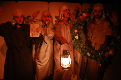 Comienzan a probar diferentes escenas. Vemos distintas composiciones en las que cambian de vestuario y juegan con la iluminación. El director va corrigiendo algunas cosas, sugiere entonaciones, posturas, actitudes y anima al equipo. Los intérpretes, en la voz de los cuatro vocales de mesa, reflexionan en torno a la temática de la democracia; juegan con el concepto y lo recorren en su amplio espectro. Me sorprende la ironía con la que se exponen en su propio quehacer cuestionando su lugar en el “teatro político” de hoy. Son ágiles en sus movimientos y en la interpretación, hay juegos de palabras que son cómicos y a ratos olvido la densidad del tema. Telas sobre sus cuerpos, diálogos con ritmo y constantes interpelaciones entre los personajes, es la imagen final que nos permite ver el director. En estos pocos minutos, ya se logra vislumbrar que la obra dejará varias interrogantes. Una de ellas y la más directa, sin duda, será la frase que llevan estampadas en unas de sus ropas de cambio: “El futuro no será una fiesta”.