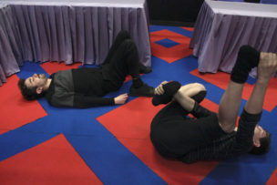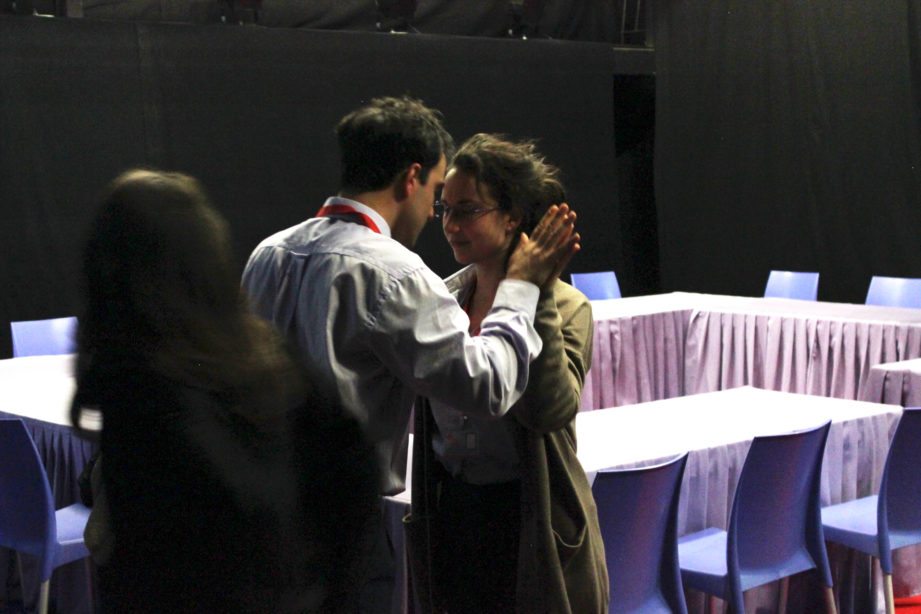 Una vez que terminan arreglarse bajan al escenario donde se encuentran con Andreina Olivarí, juntos hacen un círculo en el que están todos y todas presentes. Olivarí arenga a los intérpretes con todo el ánimo, les entrega confianza y palabras de confort recalcando que no importa qué pase, siempre tienen que dar lo mejor de ellos. Manzi también entrega palabras a sus compañeros y proceden a hacer una especie de ritual de tres partes. Primero frotan sus manos con rapidez y las levantan ágilmente, para terminar con las palmas juntas en una posición específica. Luego bajan tomados de las manos para repetir el clásico “mierda, mierda, mierda” y finalmente se ponen en parejas, golpean sus pechos con las manos en puño y se abrazan fraternamente. Todos pasan por esto con su compañeros y la complicidad del equipo es sobrecogedora. Ahora si están preparados para comenzar con Tú Amarás.