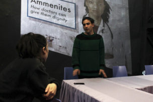 Ahora todas esas escenas que escuché en el camarín se vuelven más reales, veo al elenco dar vueltas por la escenografía, puedo observar a los médicos discutir sobre la llegada de los “amenitas”, extraterrestres que los exponen a lidiar con todos los prejuicios frente a la otredad. Gabriel Cañas no sale del personaje, Pablo Manzi y Franco Toledo ensayan desde el piso, mientras ejercitan, Carlos Donoso transita entre ambas dinámicas y ya estamos a minutos de comenzar la función. Subimos nuevamente al camarín para que el elenco se caracterice definitivamente.