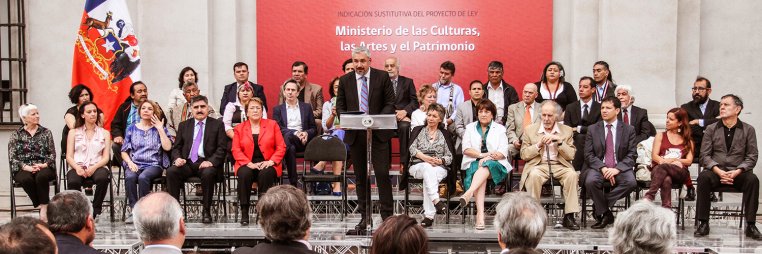 En una ceremonia que tuvo lugar en el Patio de Los Naranjos del Palacio La Moneda, la Presidenta Michelle Bachelet junto a los ministros de Cultura, Ernesto Ottone; Educación, Adriana Delpiano; y Hacienda (s), Alejandro Micco; firmaron la indicación sustitutiva al Proyecto de Ley que crea el Ministerio de las Culturas, las Artes y el Patrimonio. Este documento establece la creación de la nueva cartera , la que tendrá domicilio en Valparaíso y será la encargada de colaborar con la figura del Presidente de la República en el diseño, formulación e implementación de políticas, planes y programas, para contribuir al desarrollo cultural y patrimonial armónico y equitativo del país en toda su diversidad.