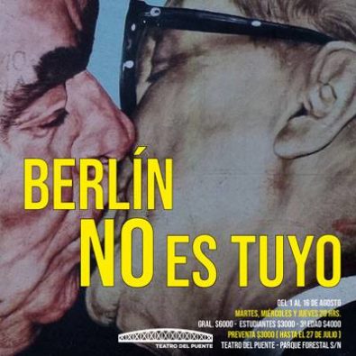 “Berlín no es tuyo” es la historia de quien es abandonadx por otrx que emigra a Berlín. Encerradx en un baño desarrolla una intensa narración donde combina sus vivencias y recuerdos con datos y hechos históricos proporcionados por una guía turística previa a la caída del muro, para guiar los pasos de su ex pareja en ese lugar. Con estos hechos históricos intenta asimilar y comprender el abandono y lidiar con su delirio. La lectura de esta guía turística es la metáfora perfecta de un amor-ciudad que tampoco existen.