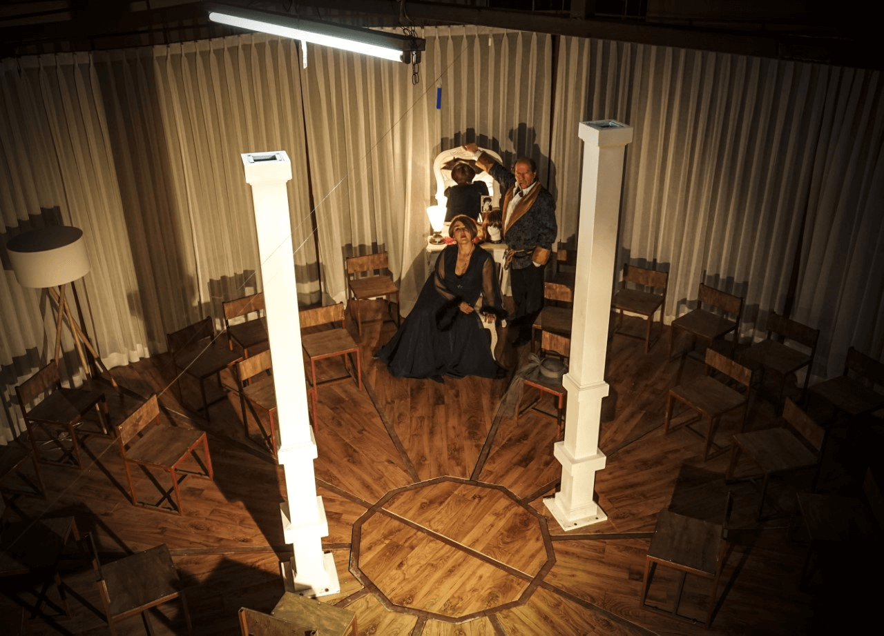 Actores y público conviven dentro de una estructura decagonal, que se mueve, vibra y desarma mientras avanza la historia. Un matrimonio discute dentro de su departamento. Son dos personas sin memoria que, entrampadas en sus conflictos, viven ajenas a lo que sucede a su alrededor, hasta que la crisis traspasa las paredes y su mundo comienza a derrumbarse. Se invita a los espectadores a vivir una particular experiencia teatral dentro de una gran estructura-escenografía.